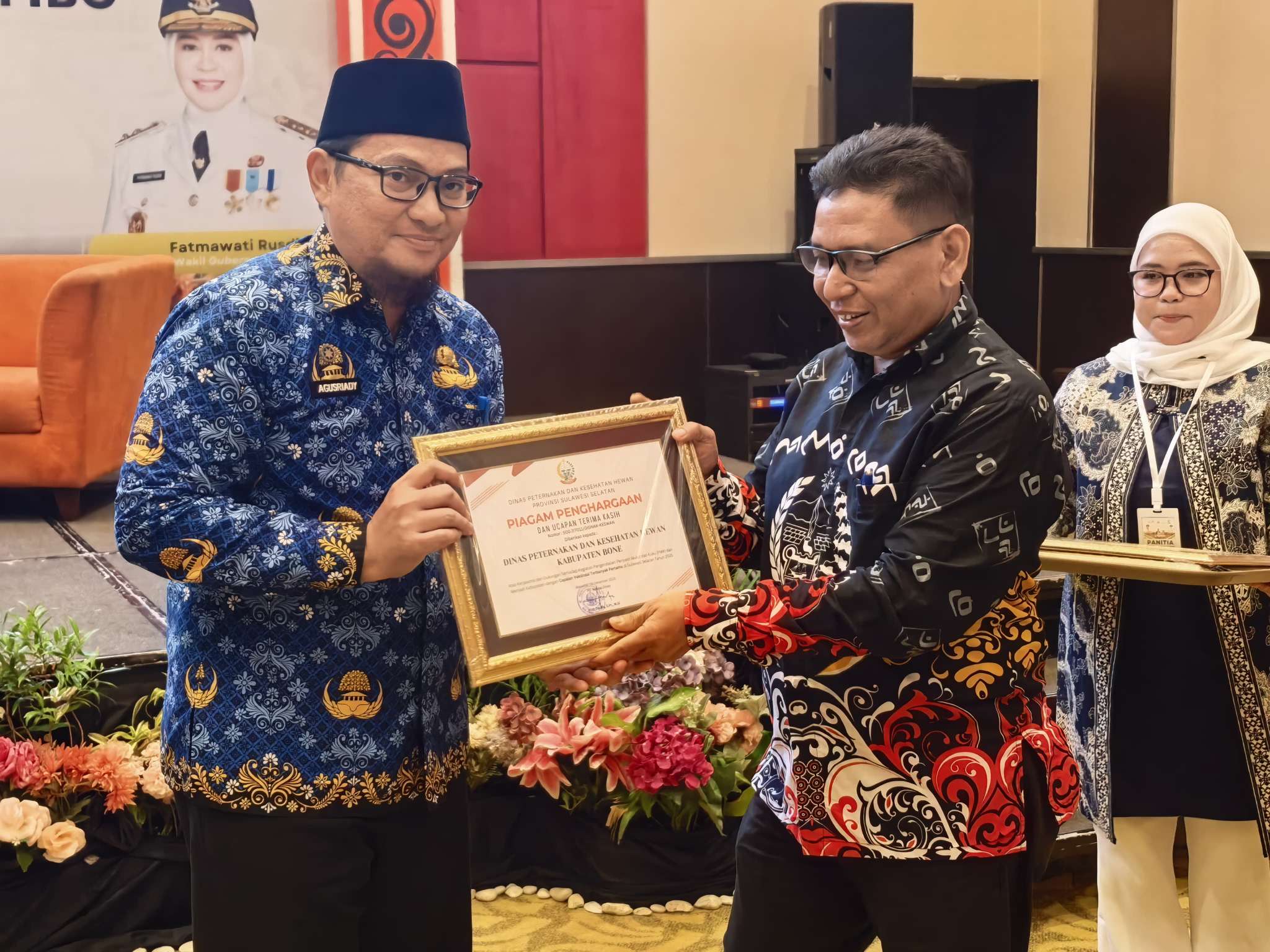 Kepala Dinas Peternakan dan Kesehatan Hewan Provinsi Sulawesi Selatan menyerahkan langsung penghargaan tersebut kepada Pelaksana Tugas Kepala Dinas Peternakan dan Kesehatan Hewan Kabupaten Bone, drh. Agusriady, M.Anim.Sc.